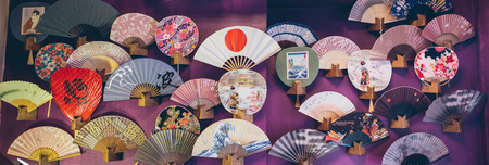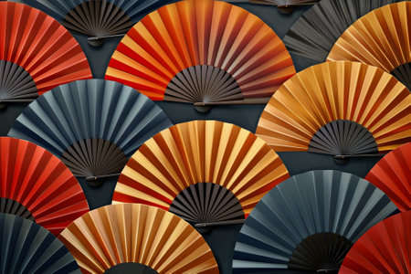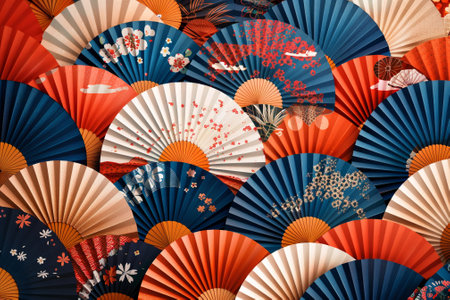 A collection of colorful paper fans with a floral design. The fans are arranged in a way that creates a sense of depth and movement. Scene is one of elegance and sophistication