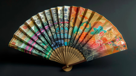 A traditional Japanese fan made entirely from folded and layered digital currency displaying intricate patterns and designs