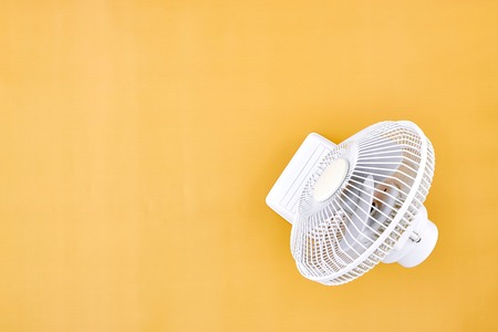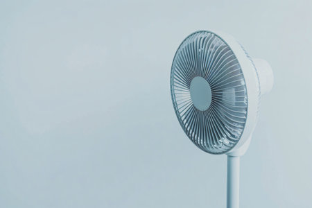 White portable fan blows fresh air on a blue background, providing a cool breeze on a hot summer day