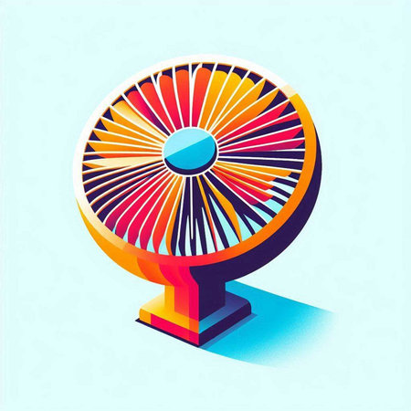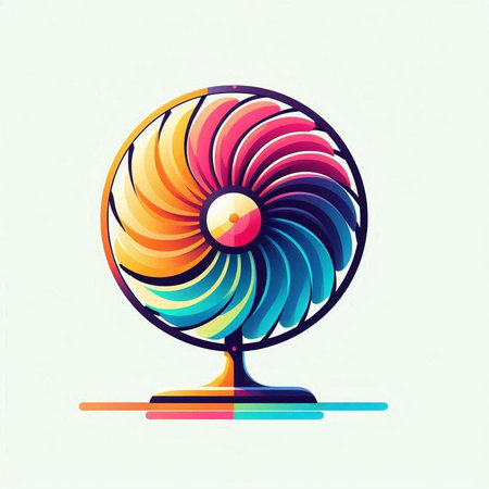A vibrant wall-mounted fan accentuated with colorful blades against a split pink and blue background, ideal for adding a playful touch to modern interiors.