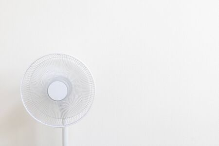 Modern electric portable fan on a white coffee table in bedroom. Cooling of high air temperature. Minimal style, copy space.