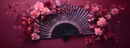 Festival paper fans and blossom flowers on pink background. Happy Chinese New Year