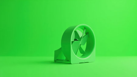 Clean, minimalist 3D render of a vibrant green cooling fan, perfect for technology, summer, or spring themed projects. Isolated on a chroma key green screen for easy background removal. Ideal for websites, presentations, and graphic design. Modern and simple design.
