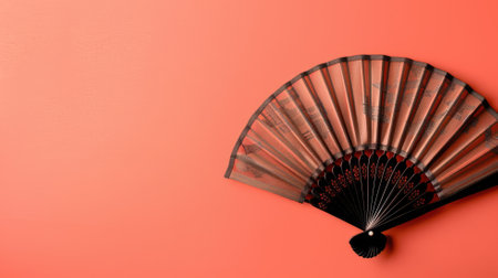 An elegant black fan with a golden handle rests on a vibrant background of blue, pink, and orange. Perfect for artistic and fashion projects.