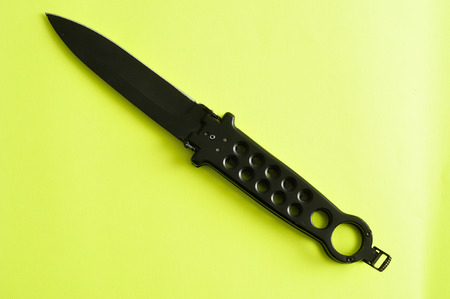 partially opened, used pocket knife with assisted opening on a black textured paper