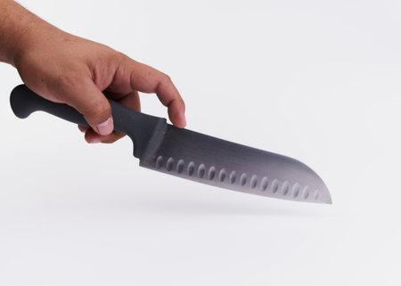 Kitchen knife in a mans hand, holds diagonally on a white background
