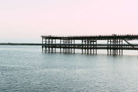 Wooden pier leading into the sea at sunset. Dramatic seascape.