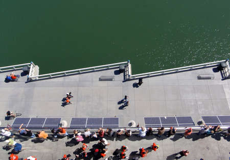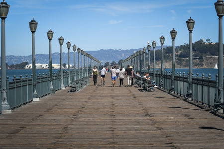 Tourists and local people are walking and enjoy the scenic view along Pier 7, San Francisco, USA.