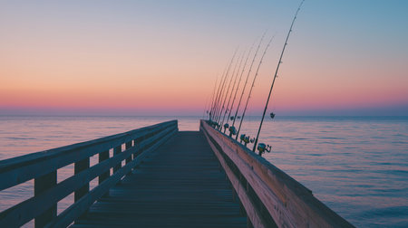 Serene early morning fishing pier with rods set against a tranquil ocean at dawn