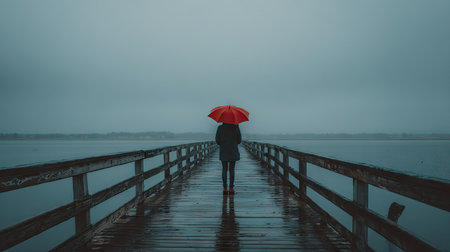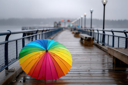 A vibrant rainbow umbrella is placed on a wooden pier under a gray sky, with raindrops falling nearby.
