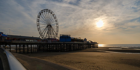 Serene sunset view with a Ferris wheel silhouette against a vibrant sky, capturing the essence of coastal leisure.