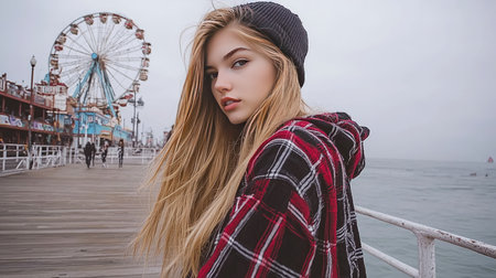 Beautiful young blonde woman in a red checkered jacket on the pier near the ferris wheel