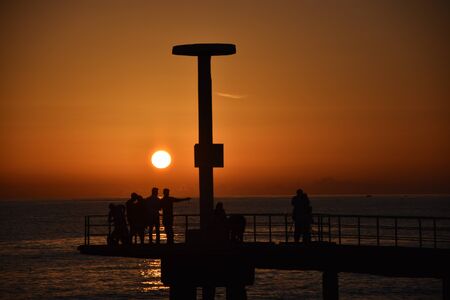 Sunrise in a mediterranean harbor (Pont del Petroli, Badalona, Barcelona, Catalonia, Spain). People are taking photos at the end of pontoon.