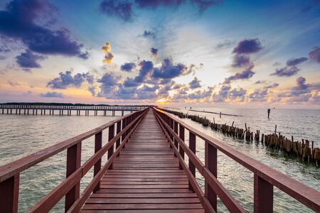 Wooden pier leading into the sea at sunset. Beautiful seascape.