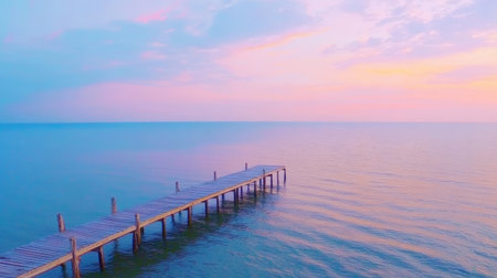 Wooden pier extending into a tranquil ocean, surrounded by a vibrant pastel sunset sky, creating a serene and idyllic scene perfect for a peaceful vacation getaway