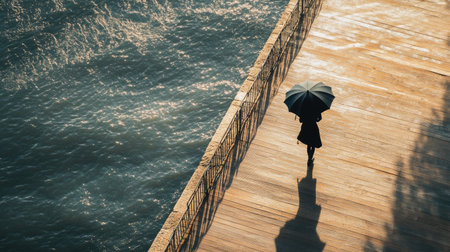 A person holding an umbrella while walking along a boardwalk on a sunny afternoon
