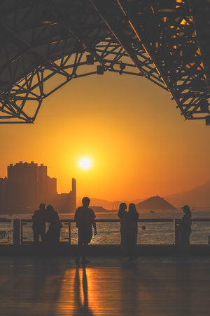 Silhouetted figures line a waterfront promenade as the sun sinks behind Nov 16 2025