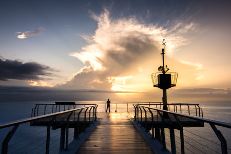 A person standing on the bridge over the calm sea under a cloudy sky at sunset in Spain
