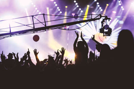 Stage lights and crowd of audience with hands raised at a music festival. Fans enjoying the party vibes.