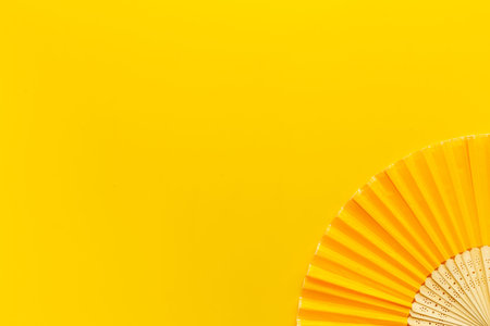 Yellow open hand fan made of bamboo and paper. Top view