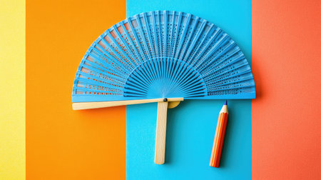 A decorative fan rests on a bright surface showcasing its intricate designs and contrasting colors of orange and blue in an artistic arrangement.