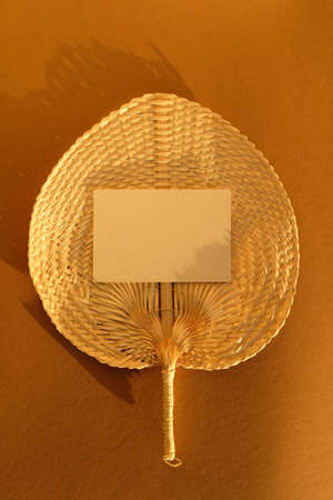 Paper card mockup in rattan plate in sunlight of sunset.