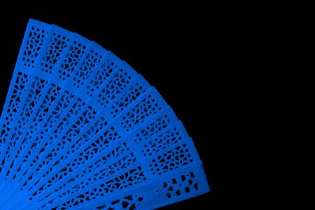 Blue fan with openwork pattern isolated on black background close-up
