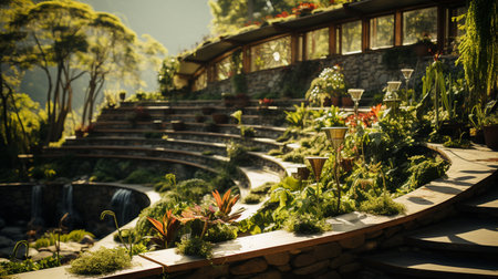 Sunlight illuminating the slopes of a green rice paddy terrace in Asia, a beautiful view of agricultural land