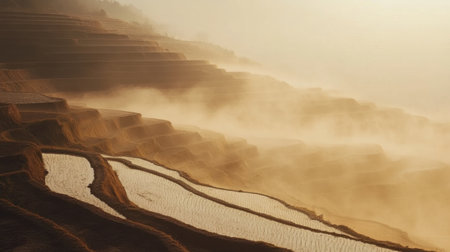 Captivating view of rice terraces enveloped in mist at sunrise, showcasing the beauty of rural agriculture. A serene and tranquil landscape that invites exploration.