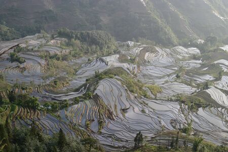 Terraced fields at dusk in Yuanyang county, Yunnan province, China