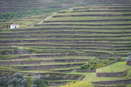 The image features a vast landscape of terraced fields winding across the hills. The scene is bathed in warm sunlight. The composition is visually appealing, with patterns and textures created by the agricultural terraces. The overall aesthetic is serene.