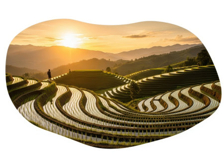 Experience the tranquility of lush rice terraces under a stunning sunset. This beautiful landscape captures the harmony of nature and agriculture in a vibrant setting.