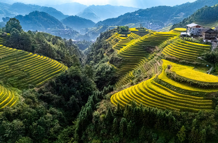 Lush terraced rice fields cascade down hillsides, illuminated by the morning sun. Nearby, a quaint mountain village rests among misty valleys, highlighting traditional farming methods.