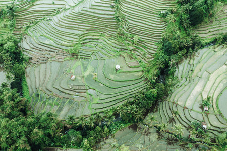 Aerial drone view of Tegallalang Rice fields terraces in Ubud, Bali, Indonesia
