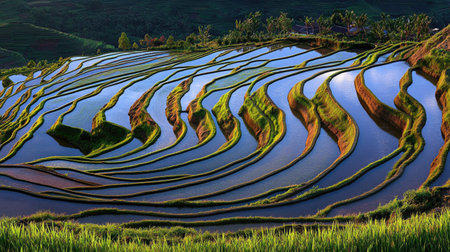 Lush green terraced rice paddies on a steep mountainside, reflecting sunlight in the water filled steps, showcasing agricultural beauty and traditional farming.