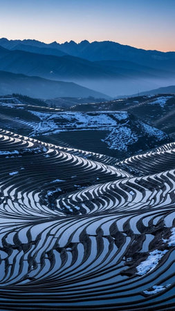 Terraced farmlands with snow, mountains, and misty valleys at twilight