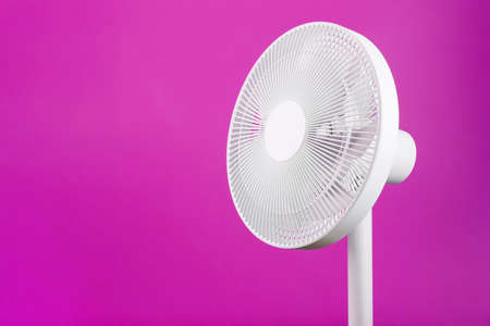Modern electric fan on violet background, closeup. Space for text