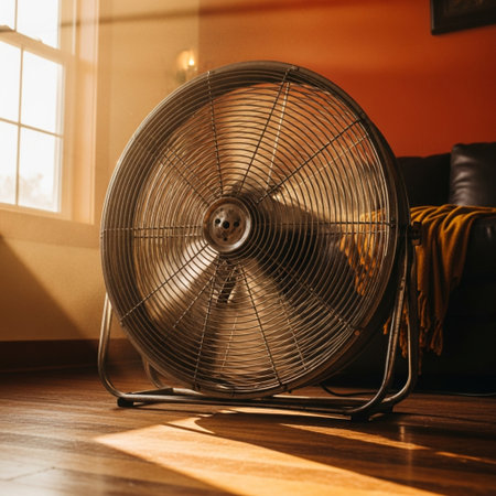 Large operating air fan by window in on floor electrical ventilator cooling hot summer air at home domestic appliance for climate control and comfortable living