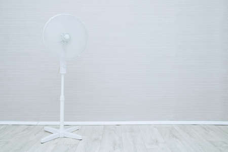 Floor-standing white fan in the interior of the room against the background of a gray wall.