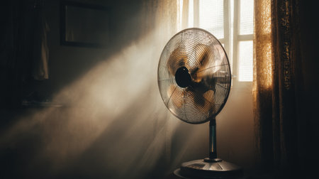 A vintage fan stands in a sunlit room, illuminated by warm rays filtering through a window, creating a serene atmosphere filled with floating dust particles.