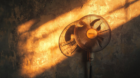 A vintage fan stands against a textured wall, illuminated by warm sunlight. The play of light and shadow creates a serene, atmospheric vibe, capturing a nostalgic moment.