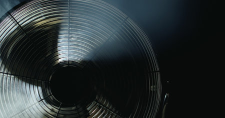 Close-up of big industrial fan in a factory. Ventilation of plant building. Backlit, sun light, rays of light.