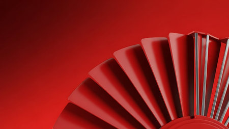 A partially opened traditional folding hand fan prominently displays its vibrant red segments, embellished with intricate black patterns. Its dark structure contrasts against a minimalist, light background, highlighting the cultural design.