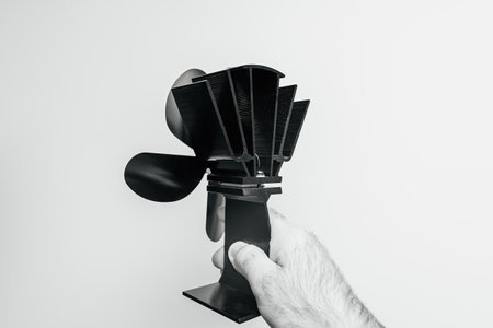 A close-up of a jet engine turbine fan with a sleek metallic finish, mounted against a white background.