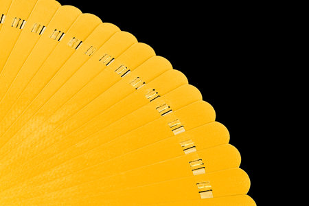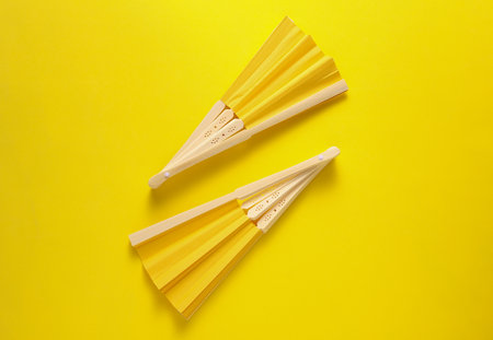 Colorful background with fan in yellow and blue colors. Minimalistic summer concept.