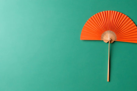 Vibrant orange folding fan against a green background, showcasing a fusion of colors and textures, perfect for cultural themes, events, or summer decor