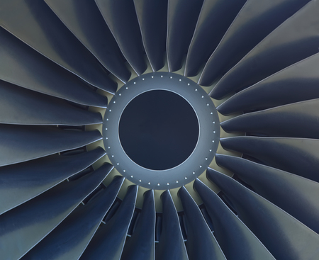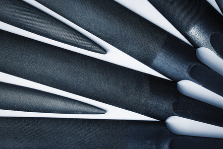Close-up of aircraft engine turbine blades as industrial background