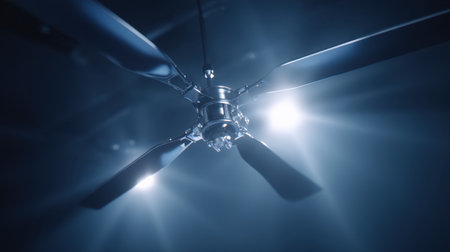 This captivating image features a modern ceiling fan with elegant blades illuminated by bright lights, creating a striking ambiance in a dimly lit room.