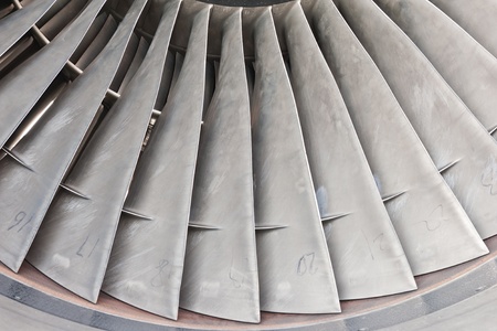 close-up of a large jet engine turbine blades