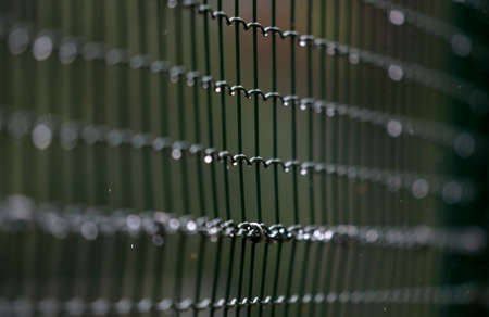 Metal Net in front of green garden after the rain. Lithuania, Nida